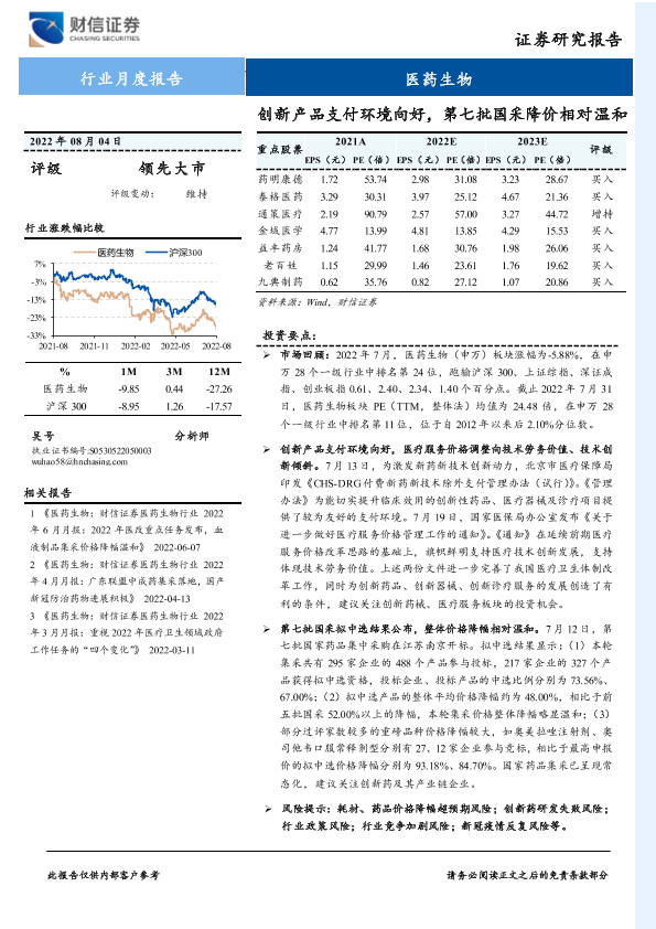 【财信证券】【20220804】医药生物行业月度报告:创新产品支付环境向好,第七批国采降价相对温和-13页