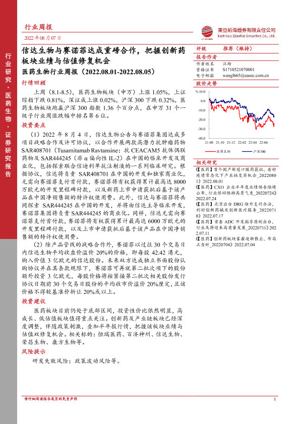 【东亚前海证券】【20220807】医药生物行业周报:信达生物与赛诺菲达成重磅合作,把握创新药板块业绩与估值修复机会-12页