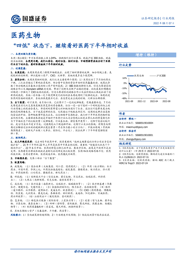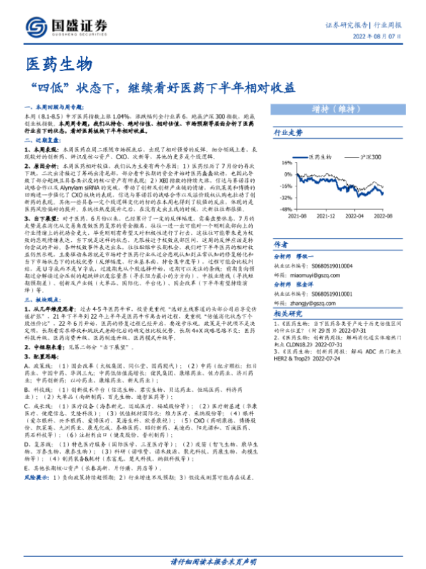 【国盛证券】【20220807】医药生物行业周报:“四低”状态下,继续看好医药下半年相对收益-23页