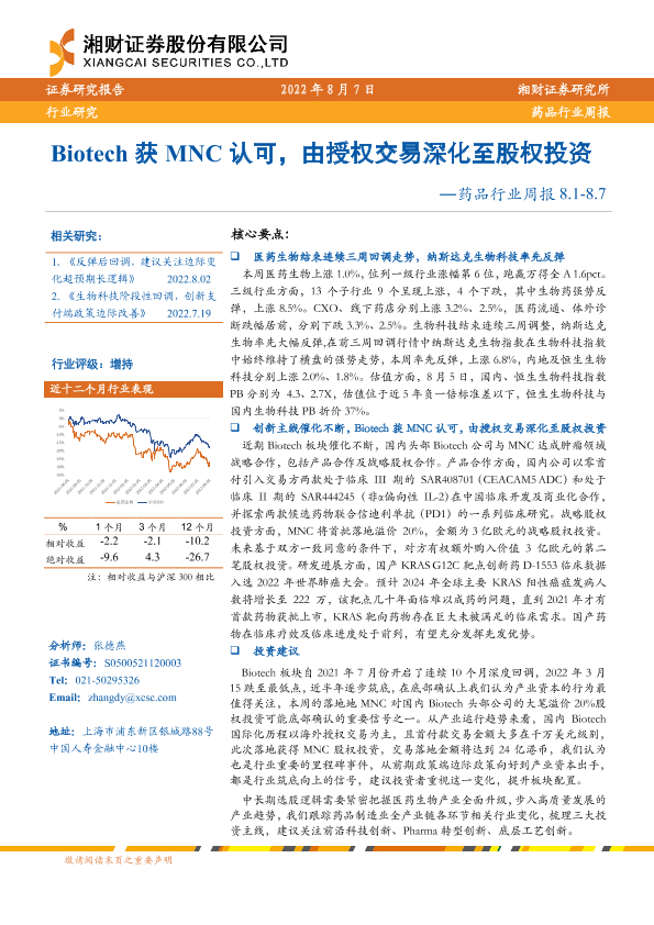 【湘财证券】【20220807】药品行业周报:Biotech获MNC认可,由授权交易深化至股权投资-17页