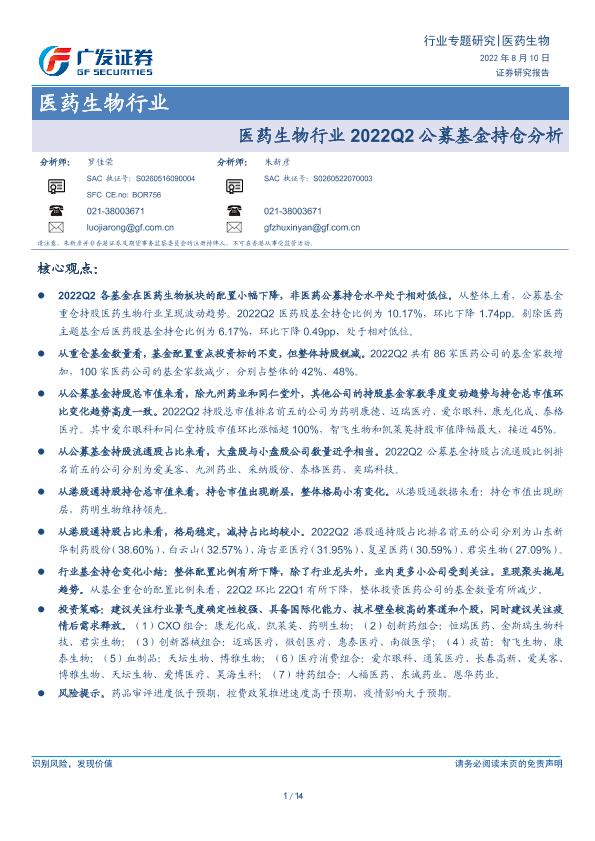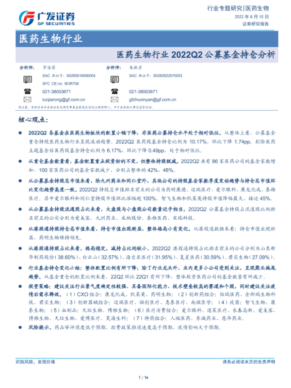 【广发证券】【20220810】医药生物行业2022Q2公募基金持仓分析-14页