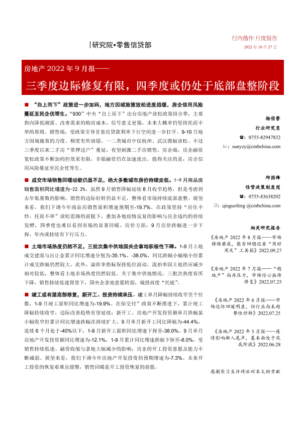 【招商银行】【20221027】房地产行业2022年9月报:三季度边际修复有限,四季度或仍处于底部盘整阶段-22页