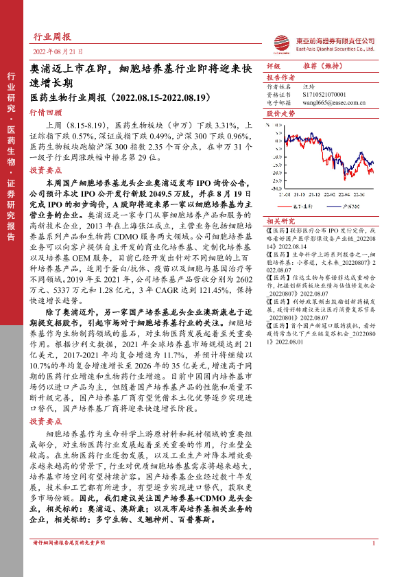 【东亚前海证券】【20220821】医药生物行业周报:奥浦迈上市在即,细胞培养基行业即将迎来快速增长期-13页