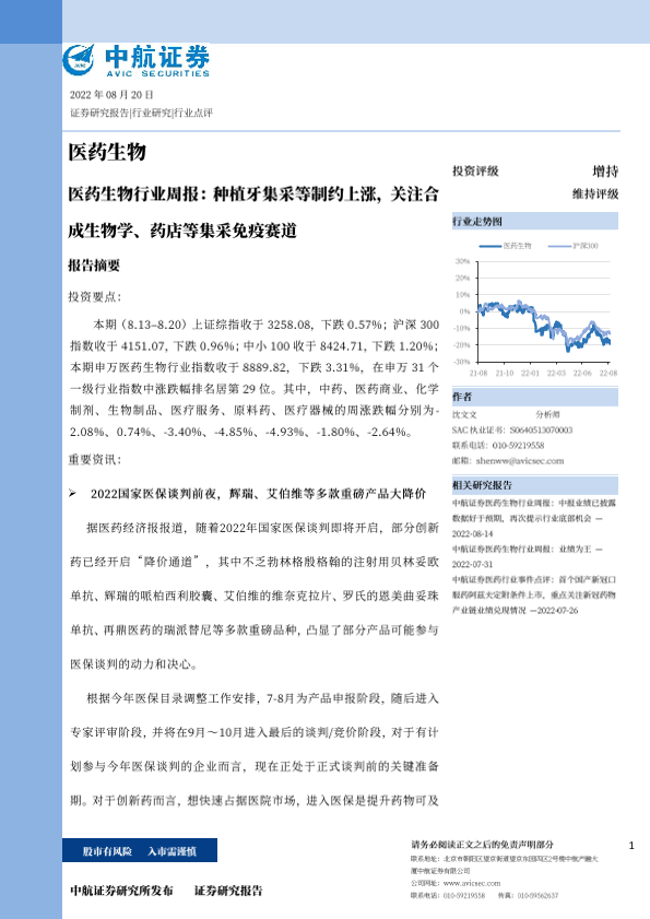 【中航证券】【20220820】医药生物行业周报:种植牙集采等制约上涨,关注合成生物学、药店等集采免疫赛道-25页