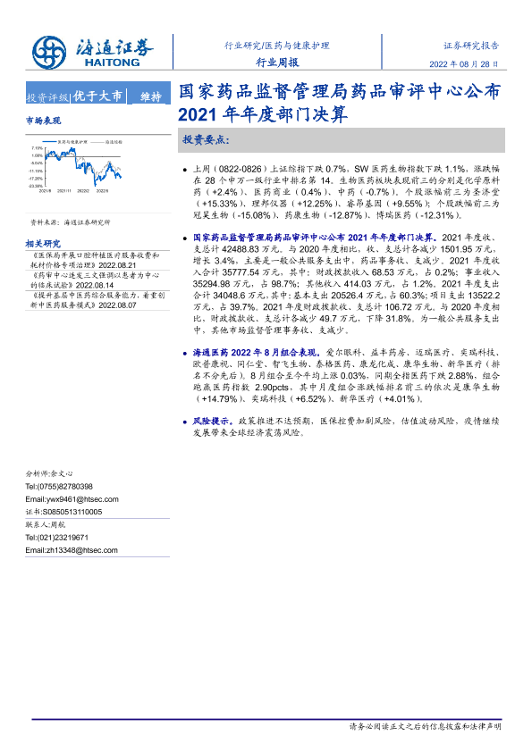 【海通证券】【20220828】医药与健康护理行业周报:国家药品监督管理局药品审评中心公布2021年年度部门决算-6页