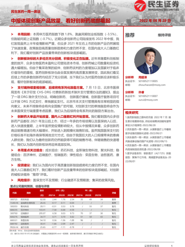 【民生证券】【20220828】民生医药一周一席谈:中报体现创新产品放量,看好创新药底部崛起-8页