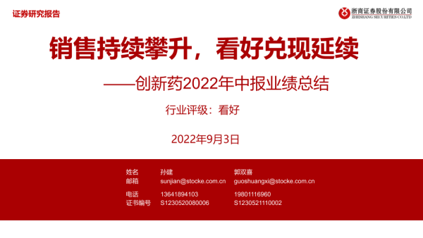 【浙商证券】【20220903】创新药2022年中报业绩总结:销售持续攀升,看好兑现延续-12页