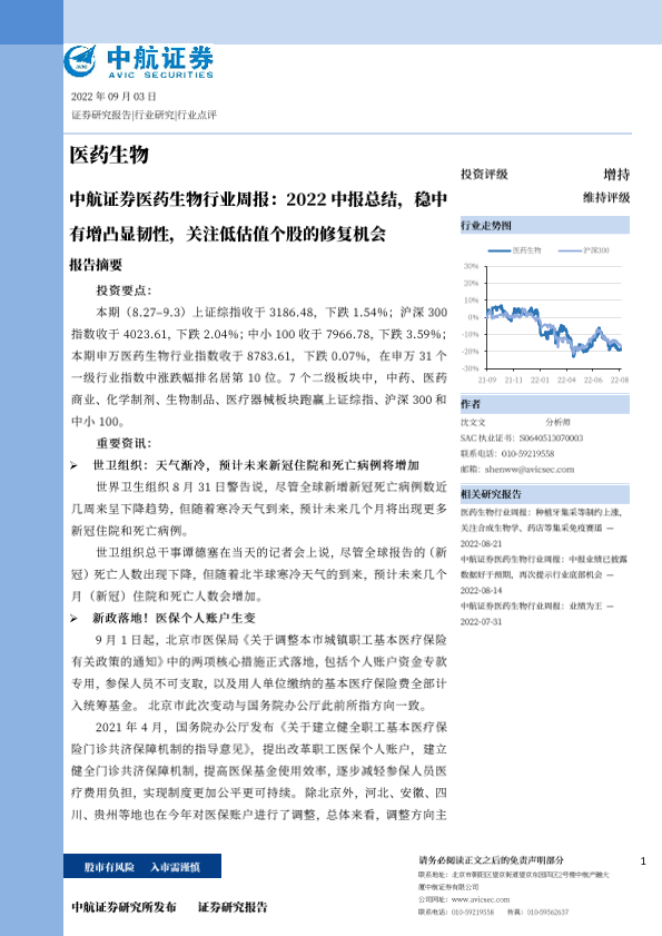 【中航证券】【20220903】医药生物行业周报:2022中报总结,稳中有增凸显韧性,关注低估值个股的修复机会-26页