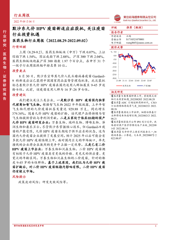 【东亚前海证券】【20220904】医药生物行业周报:默沙东九价HPV疫苗新适应症获批,关注疫苗行业投资机遇-13页