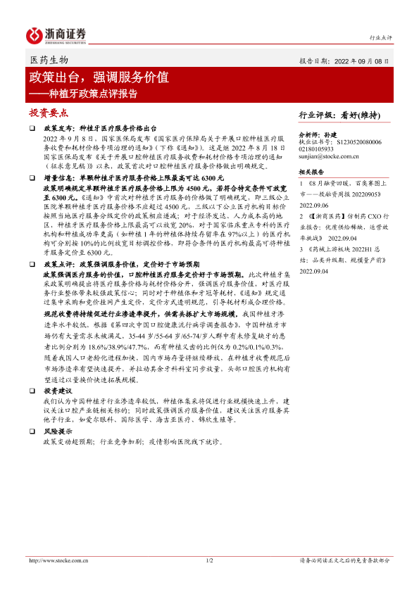 【浙商证券】【20220908】种植牙政策点评报告 - 政策出台,强调服务价值-2页