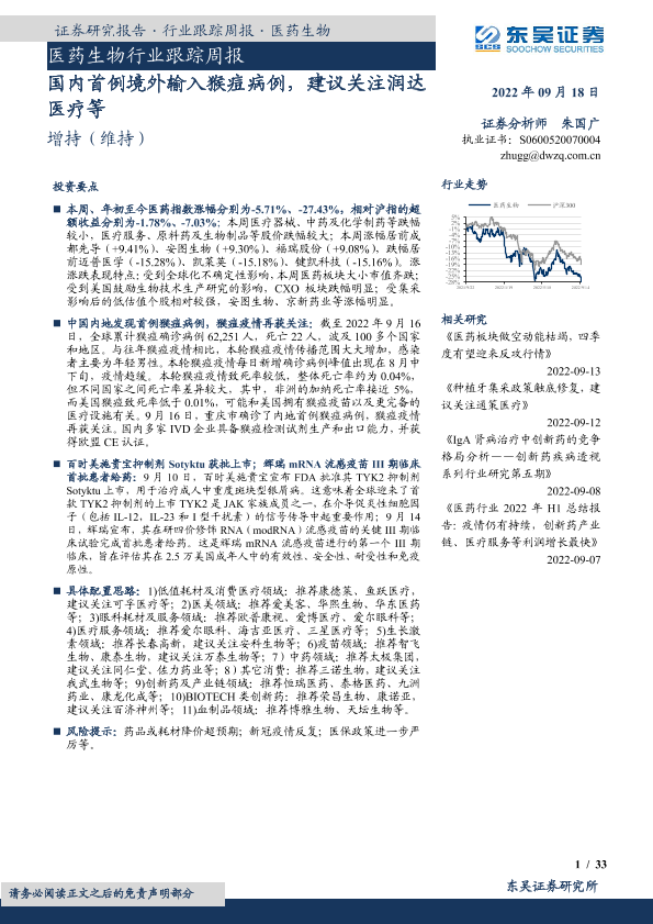 【东吴证券】【20220918】医药生物行业跟踪周报:国内首例境外输入猴痘病例-33页