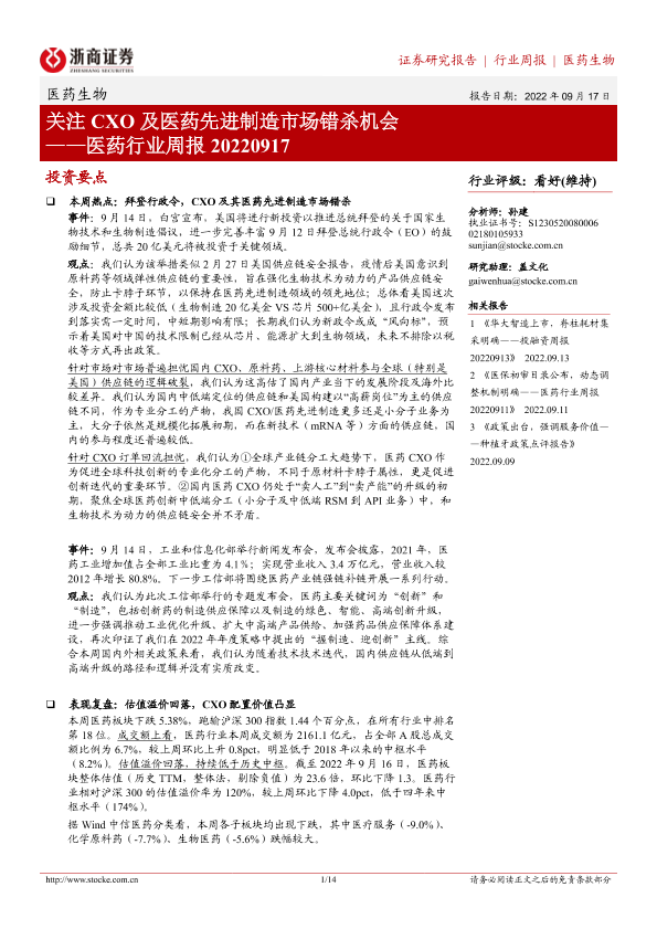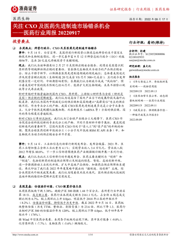【浙商证券】【20220917】医药行业周报:关注CXO及医药先进制造市场错杀机会-14页