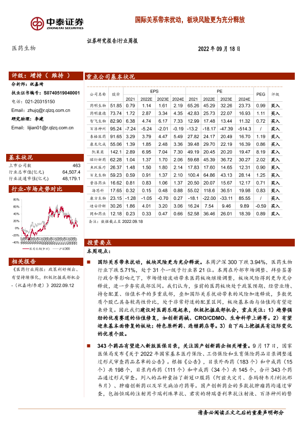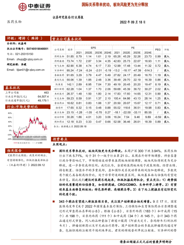 【中泰证券】【20220918】医药生物行业周报:国际关系带来扰动,板块风险更为充分释放-10页