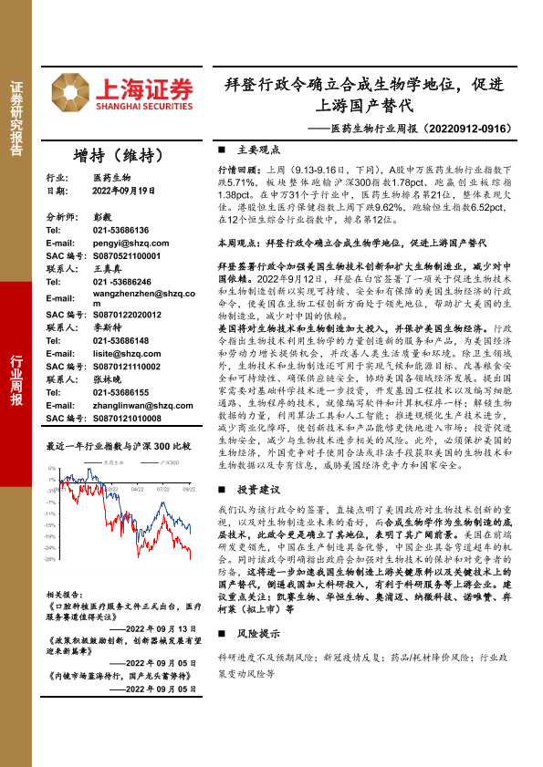 【上海证券】【20220919】医药生物行业周报:拜登行政令确立合成生物学地位,促进上游国产替代-26页