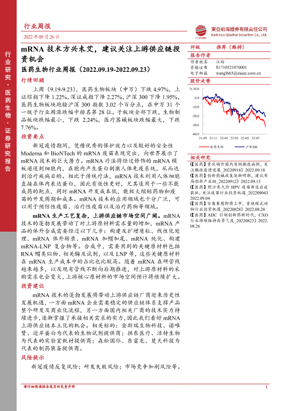【东亚前海证券】【20220926】医药生物行业周报:mRNA技术方兴未艾,建议关注上游供应链投资机会-12页