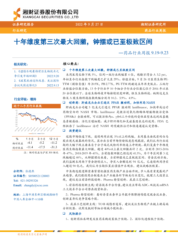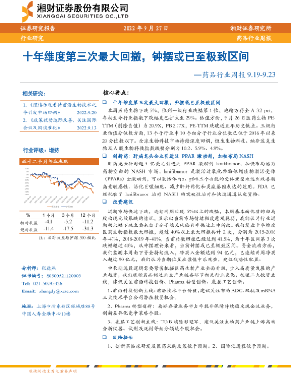 【湘财证券】【20220927】药品行业周报:十年维度第三次最大回撤,钟摆或已至极致区间-13页