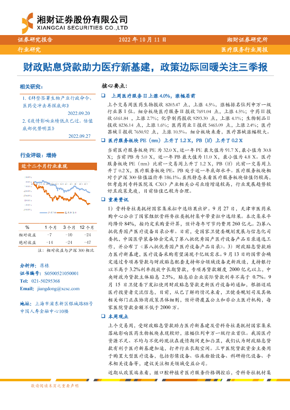 【湘财证券】【20221011】医疗服务行业周报:财政贴息贷款助力医疗新基建,政策边际回暖关注三季报-12页