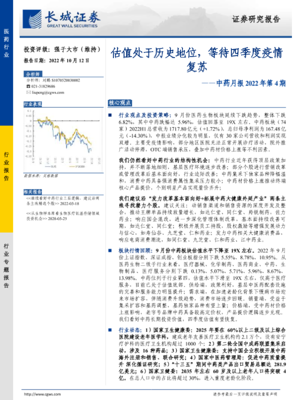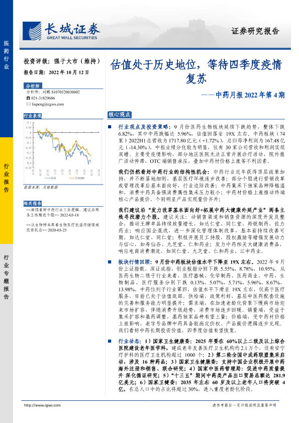 【长城证券】【20221012】中药月报2022年第4期:估值处于历史地位,等待四季度疫情复苏-14页