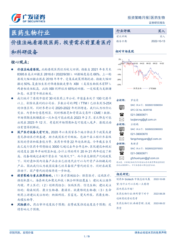 【广发证券】【20221013】医药生物行业:价值洼地看港股医药,投资需求前置看医疗和科研设备-19页