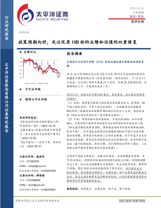【太平洋证券】【20221015】医药生物行业周报:政策预期向好,关注优质IVD标的业绩和估值的双重修复-19页