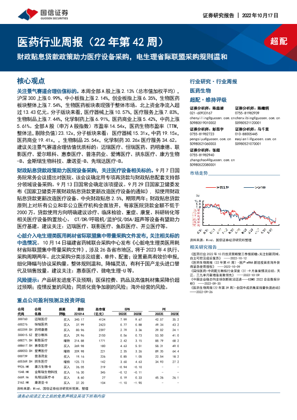 【国信证券】【20221017】医药行业周报:财政贴息贷款政策助力医疗设备采购,电生理省际联盟采购规则温和-16页