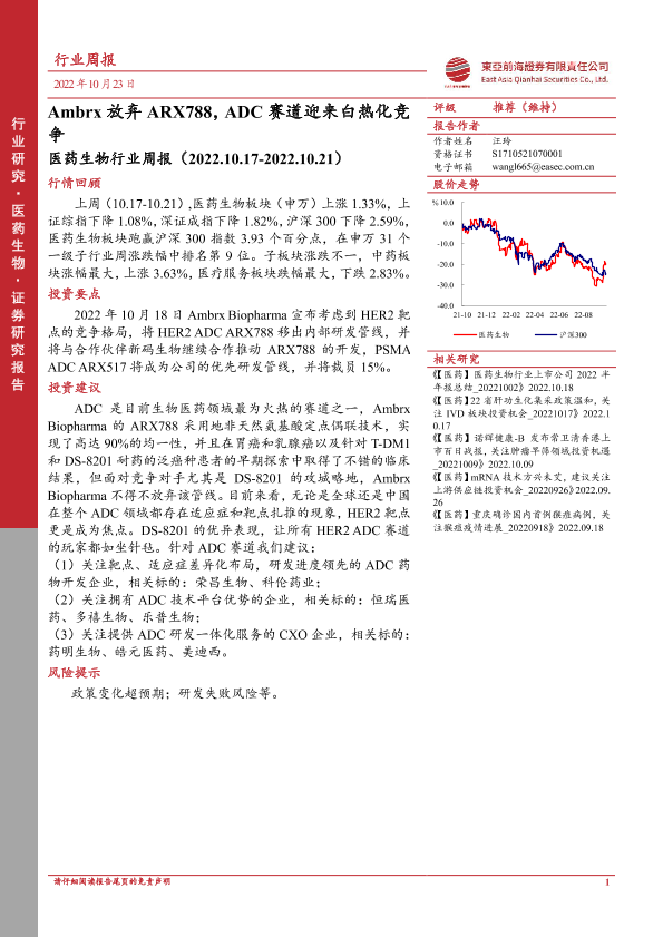 【东亚前海证券】【20221023】医药生物行业周报:Ambrx放弃ARX788,ADC赛道迎来白热化竞争-11页