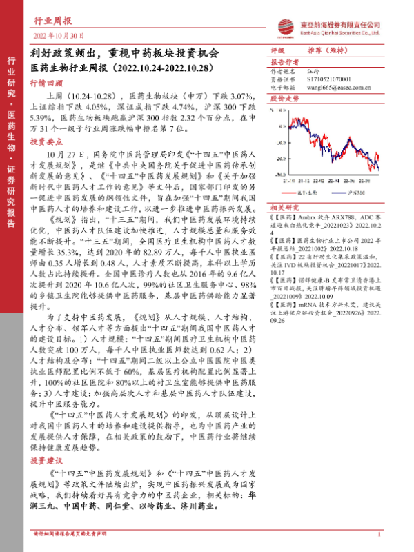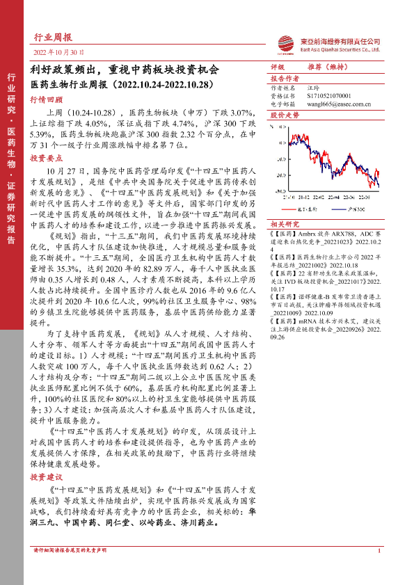 【东亚前海证券】【20221030】医药生物行业周报:利好政策频出,重视中药板块投资机会-12页