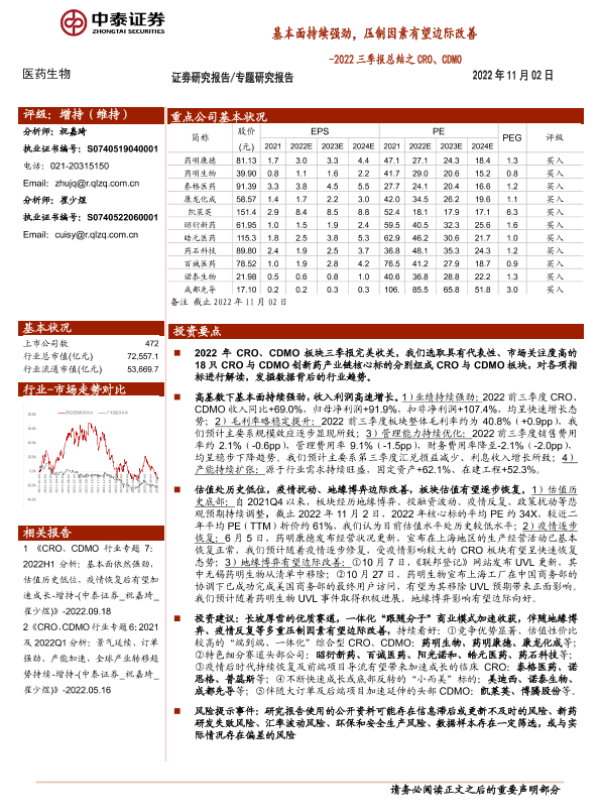 【中泰证券】【20221102】2022三季报总结之CRO、CDMO:基本面持续强劲,压制因素有望边际改善-13页