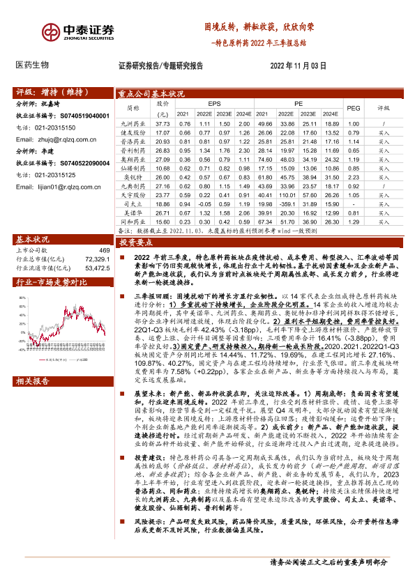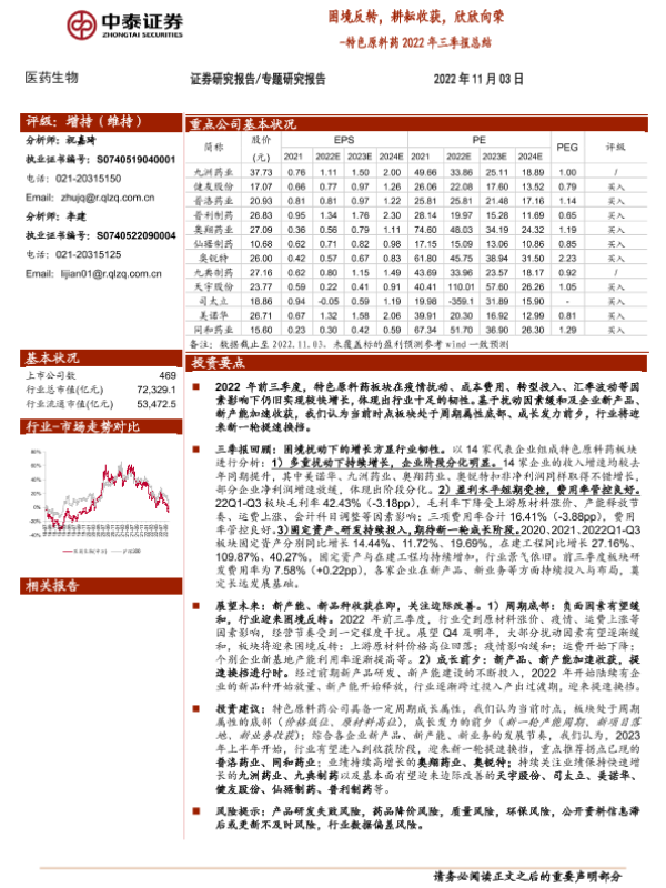 三季报 医药生物 特色原料药 行业分析 证券研究