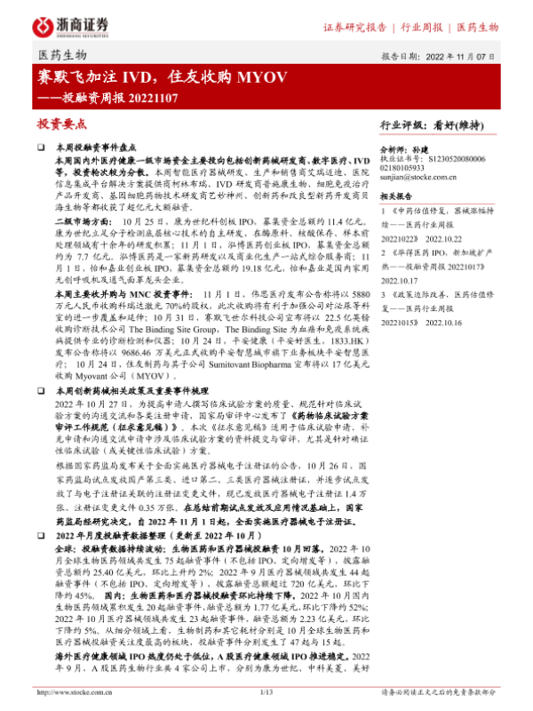 【浙商证券】【20221107】医药生物投融资周报:赛默飞加注IVD,住友收购MYOV-13页