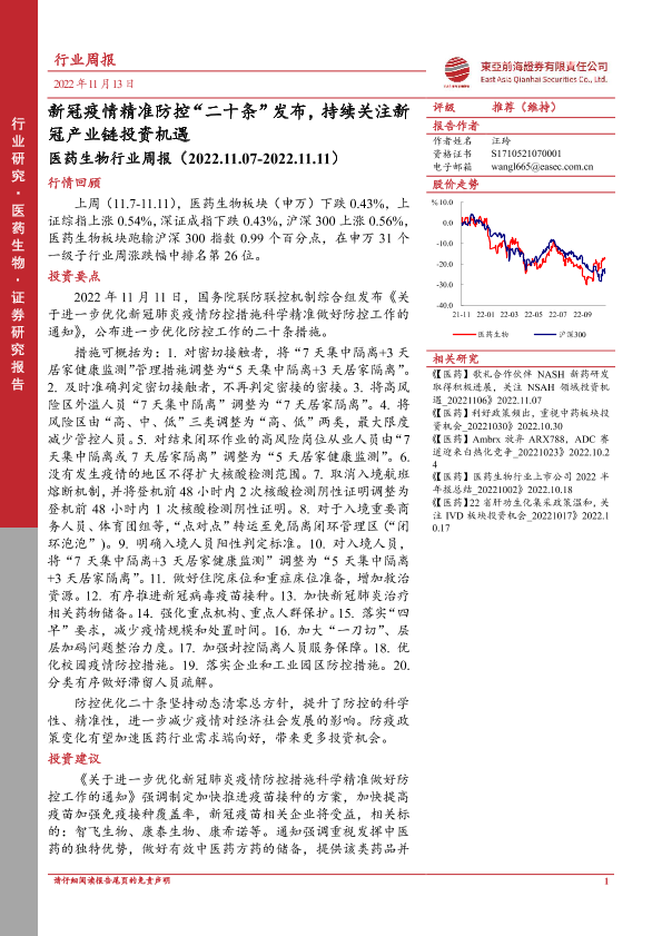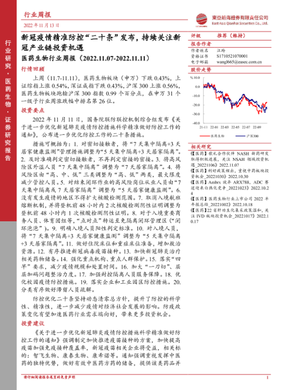 【东亚前海证券】【20221113】医药生物行业周报:新冠疫情精准防控“二十条”发布,持续关注新冠产业链投资机遇-13页