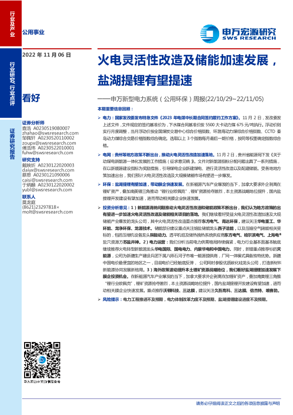 【申万宏源】【20221106】新型电力系统(公用环保)行业周报:火电灵活性改造及储能加速发展,盐湖提锂有望提速-36页