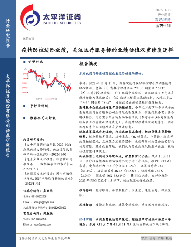 【太平洋证券】【20221113】医药生物行业周报:疫情防控边际放缓,关注医疗服务标的业绩估值双重修复逻辑-17页