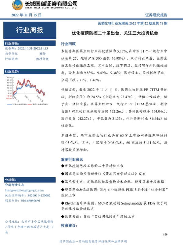 【长城国瑞证券】【20221115】优化疫情防控二十条出台,关注三大投资机会-20页