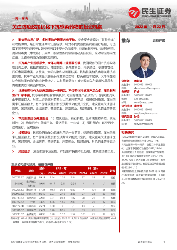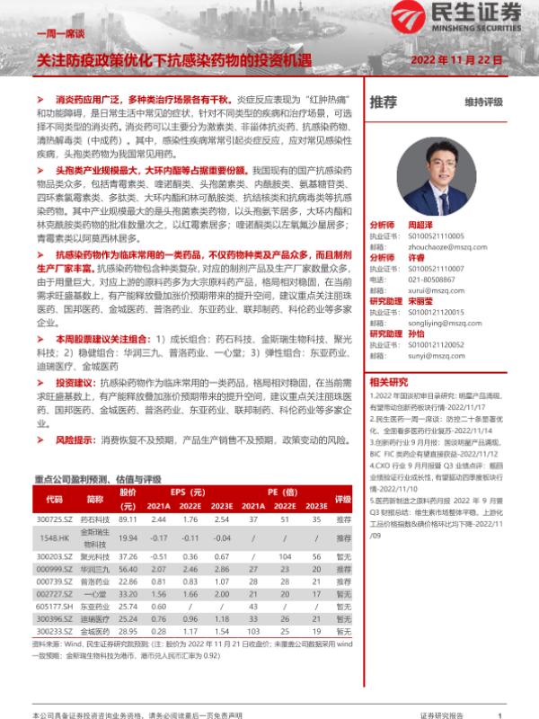 【民生证券】【20221122】医药行业一周一席谈:关注防疫政策优化下抗感染药物的投资机遇-13页