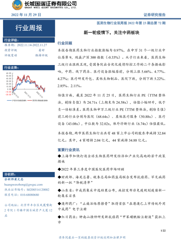 【长城国瑞证券】【20221129】医药生物行业双周报:新一轮疫情下,关注中药板块-22页