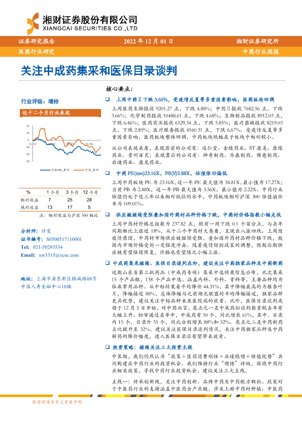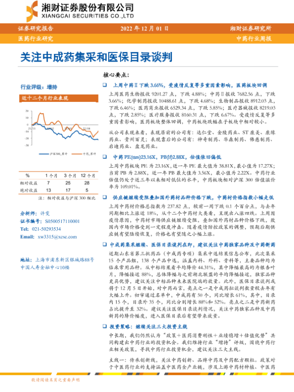 【湘财证券】【20221201】中药行业周报:关注中成药集采和医保目录谈判-12页