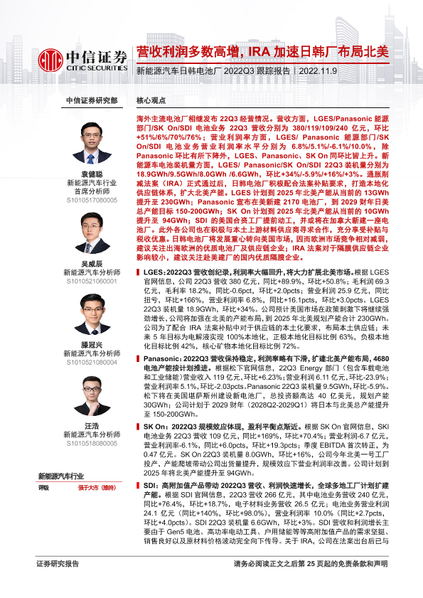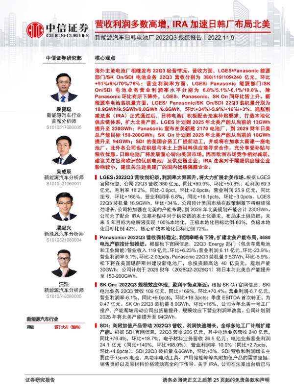 【中信证券】【20221109】新能源汽车行业日韩电池厂2022Q3跟踪报告:营收利润多数高增,IRA加速日韩厂布局北美-26页