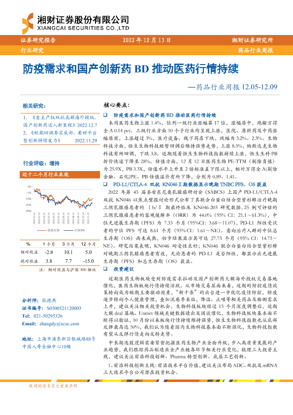 【湘财证券】【20221213】药品行业周报:防疫需求和国产创新药BD推动医药行情持续-13页