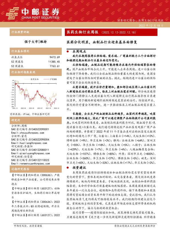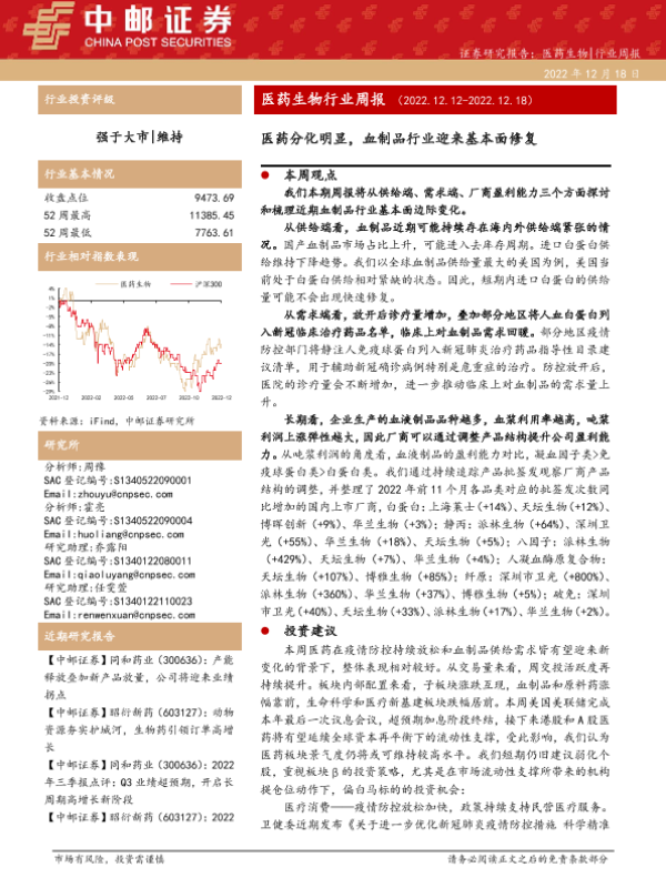 【中邮证券】【20221218】医药生物行业周报:医药分化明显,血制品行业迎来基本面修复-20页