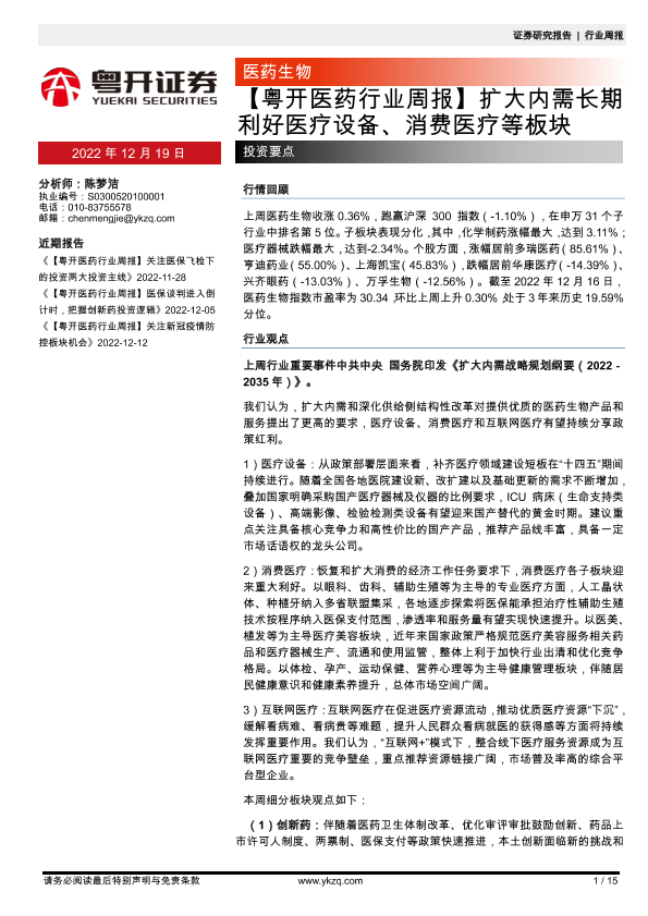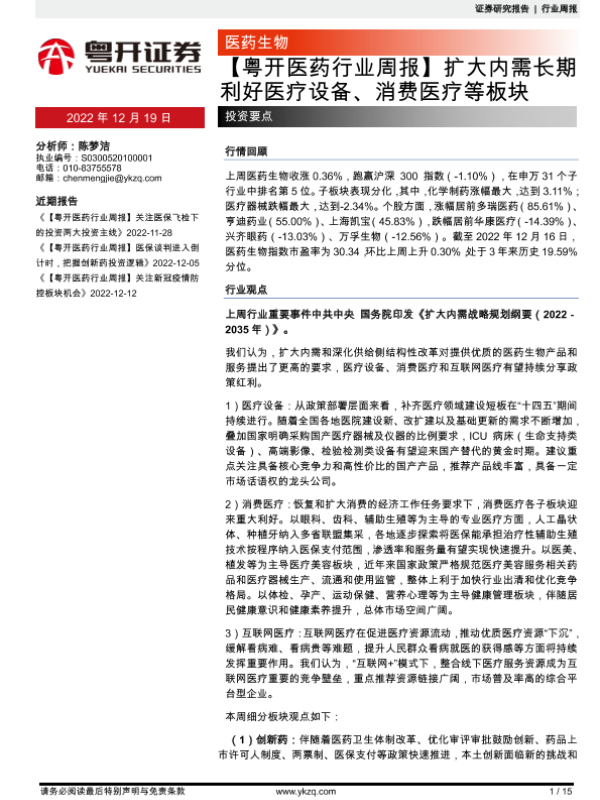 【粤开证券】【20221219】粤开医药行业周报:扩大内需长期利好医疗设备、消费医疗等板块-15页
