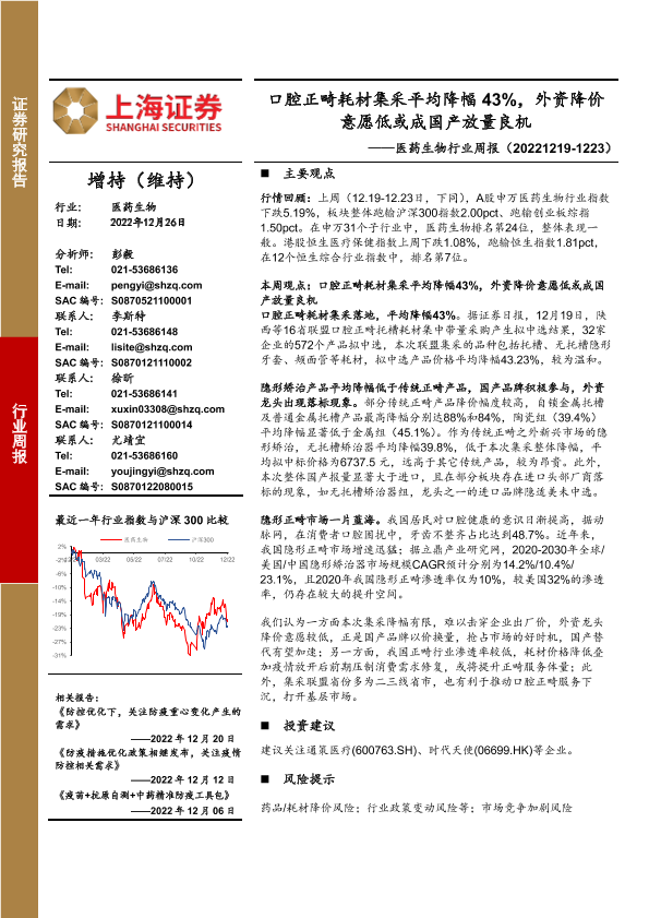 【上海证券】【20221226】医药生物行业周报:口腔正畸耗材集采平均降幅43%,外资降价意愿低或成国产放量良机-20页