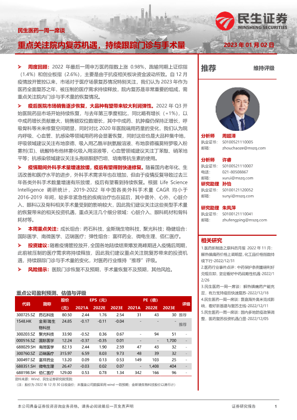 【民生证券】【20230102】民生医药一周一席谈:重点关注院内复苏机遇,持续跟踪门诊与手术量-14页