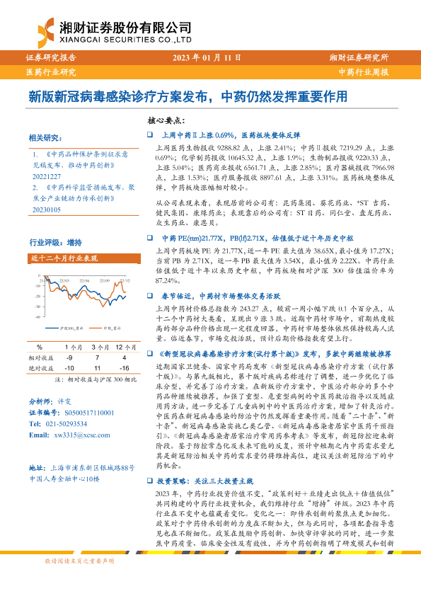 【湘财证券】【20230111】中药行业周报:新版新冠病毒感染诊疗方案发布,中药仍然发挥重要作用-12页