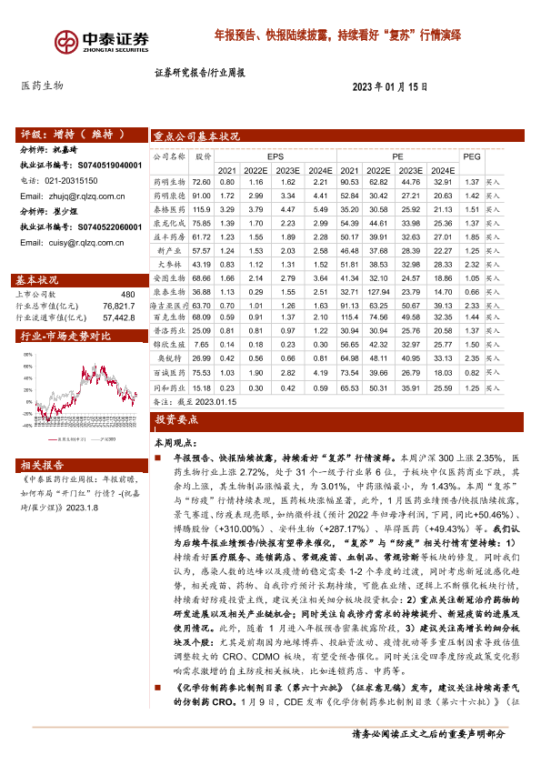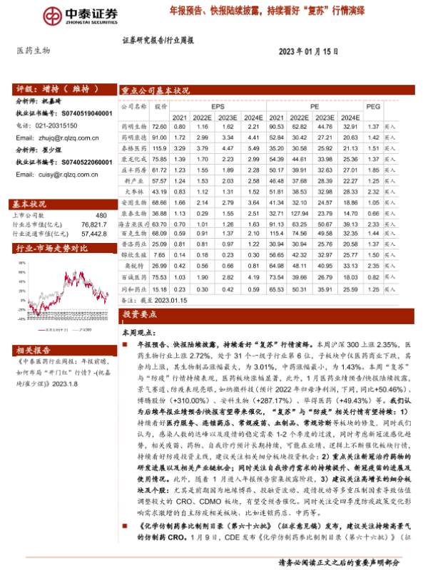 【中泰证券】【20230115】医药生物行业周报:年报预告、快报陆续披露,持续看好“复苏”行情演绎-12页