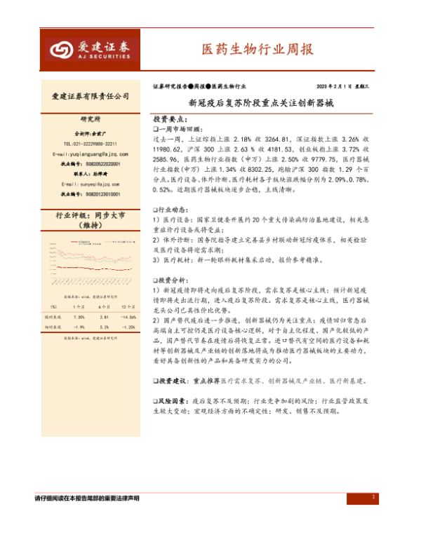 【爱建证券】【20230201】医药生物行业周报:新冠疫后复苏阶段重点关注创新器械-13页