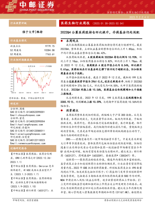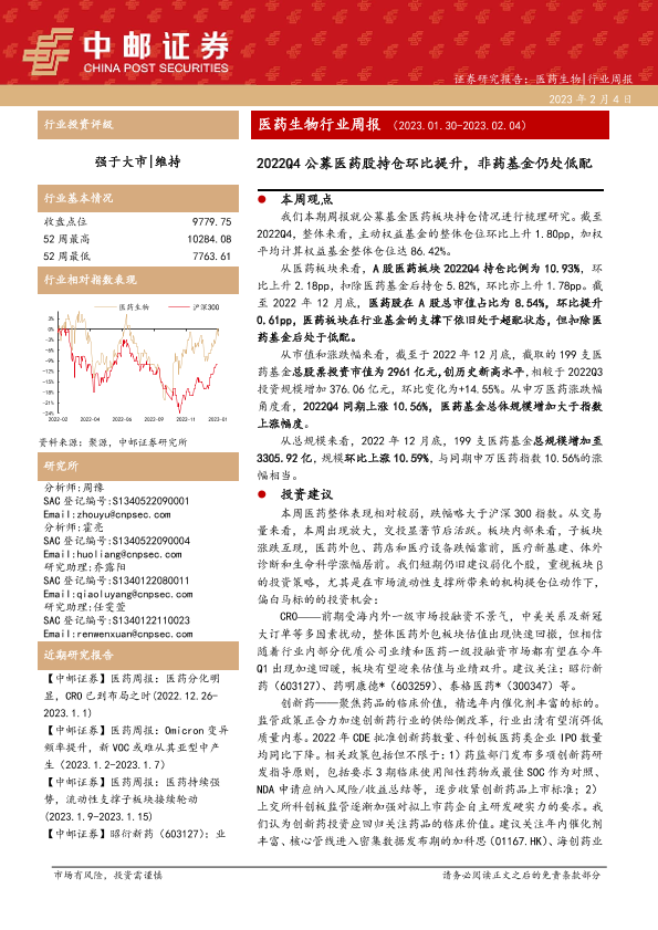 【中邮证券】【20230204】医药生物行业周报:2022Q4公募医药股持仓环比提升,非药基金仍处低配-17页