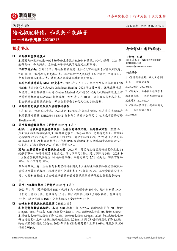 【浙商证券】【20230212】医药生物行业投融资周报:皓元拟发转债,和美药业获融资-14页