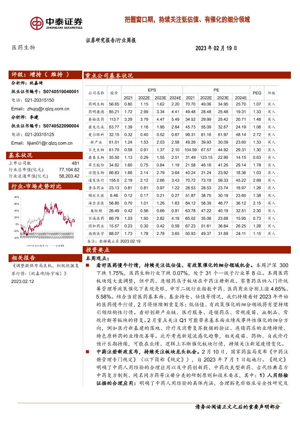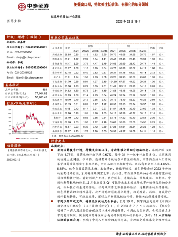 【中泰证券】【20230219】医药生物行业周报:把握窗口期,持续关注低估值、有催化的细分领域-10页