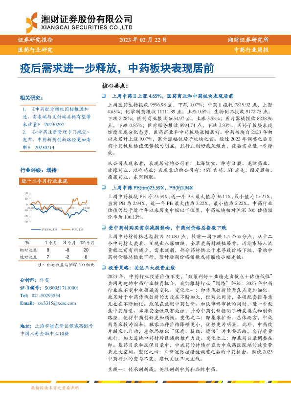 【湘财证券】【20230222】中药行业周报:疫后需求进一步释放,中药板块表现居前-12页